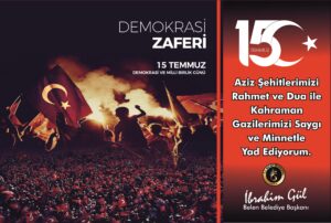 Belen Belediye Başkanı İbrahim Gül, 15 Temmuz Demokrasi ve Milli Birlik Günü vesilesiyle milletimizin istiklalini ve ülkemizin istikbalini korumak için canını hainlere siper eden tüm Şehitlerimizi rahmet, kahraman gazilerimizi minnetle anıyorum. Dedi.