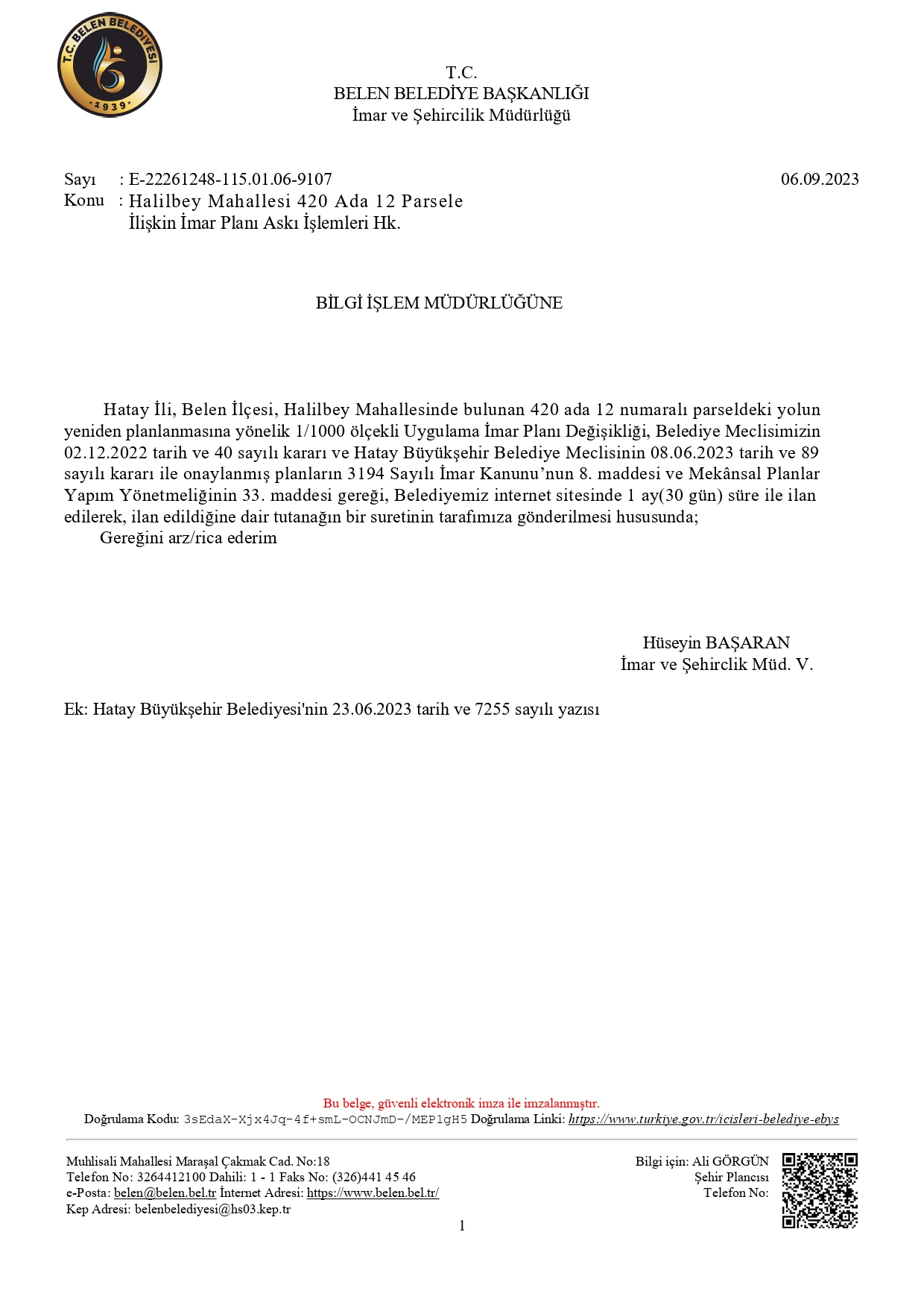 Ana Sayfa→Duyurular→Halilbey Mahallesi 420 Ada 12 Parsele İlişkin İmar Planı Askı İşlemleri Hakkında Duyuru.